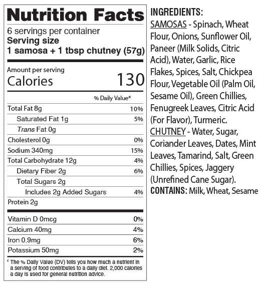 When Spinach Paneer and Samosas join forces, the result is epic. First we cook down fresh spinach (palak) with a zest blend of ginger, garlic, and spices. Then toss it with our creamy cheese (paneer) and stuff it in a hand-folded pastry crust. It's officially our favorite way to get our greens in!